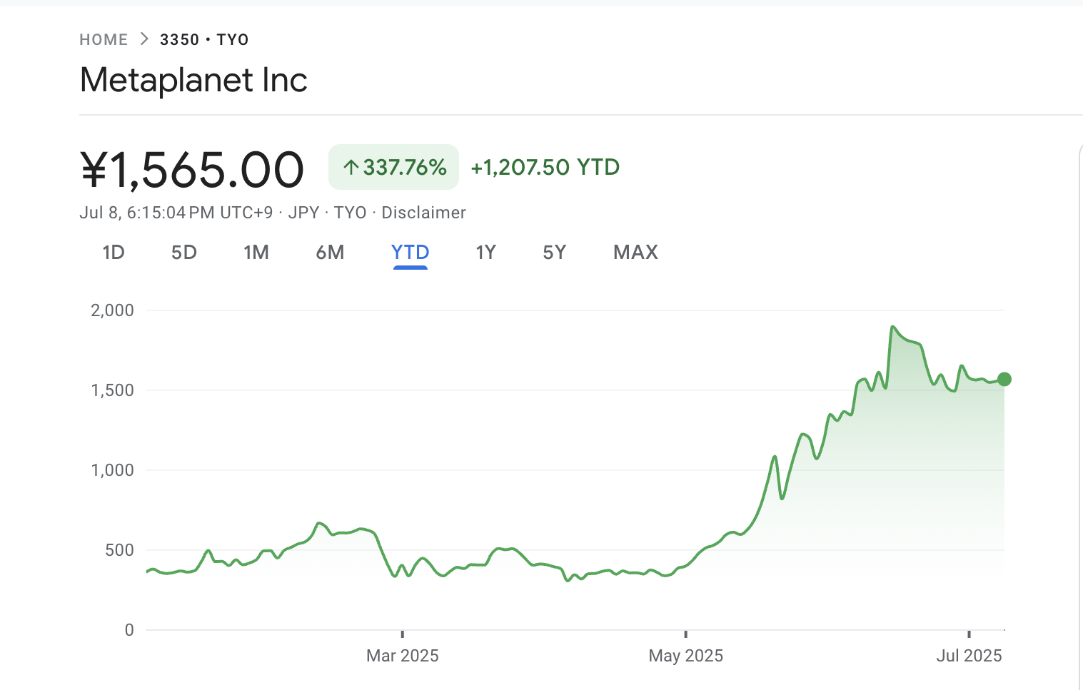 根据谷歌财经数据,Metaplanet股票(3350.T)年内涨幅达337.76%。另有报道显示,该股6月交易量激增至1.869万亿日元,超越丰田、索尼等企业巨头。自去年11月以来,其股票一直在标准市场中保持领先地位。