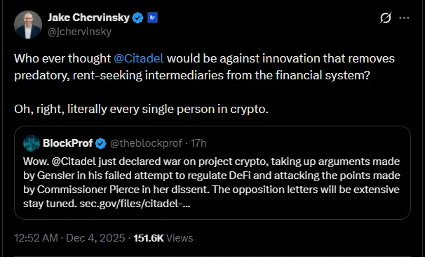 此信立即引发加密行业强烈反弹。DeFi领域多数认为Citadel的要求是保护传统做市商的变相企图。区块链协会政策顾问Jake Chervinsky于2025年12月3日发文:"谁能想到Citadel会反对消除金融体系掠夺性寻租中介的创新?...哦,加密行业每个人早就料到了。"