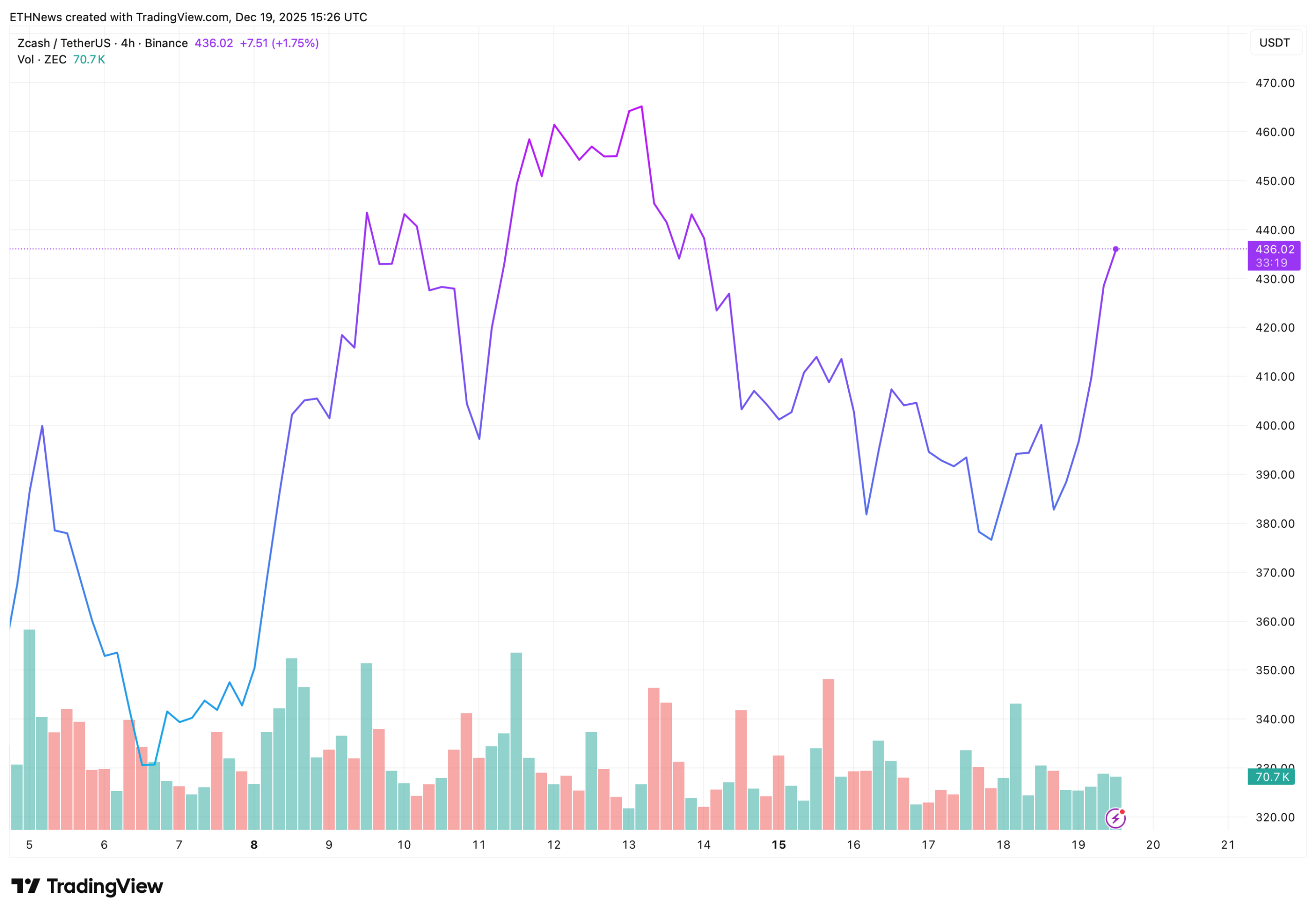 四小时图清晰展示了本轮走势的发展轨迹。Zcash曾跌至380-390美元区间,在该区域卖压逐渐衰竭而成交量放大。这个区域形成了需求口袋,引发了快速反转而非长期整理。