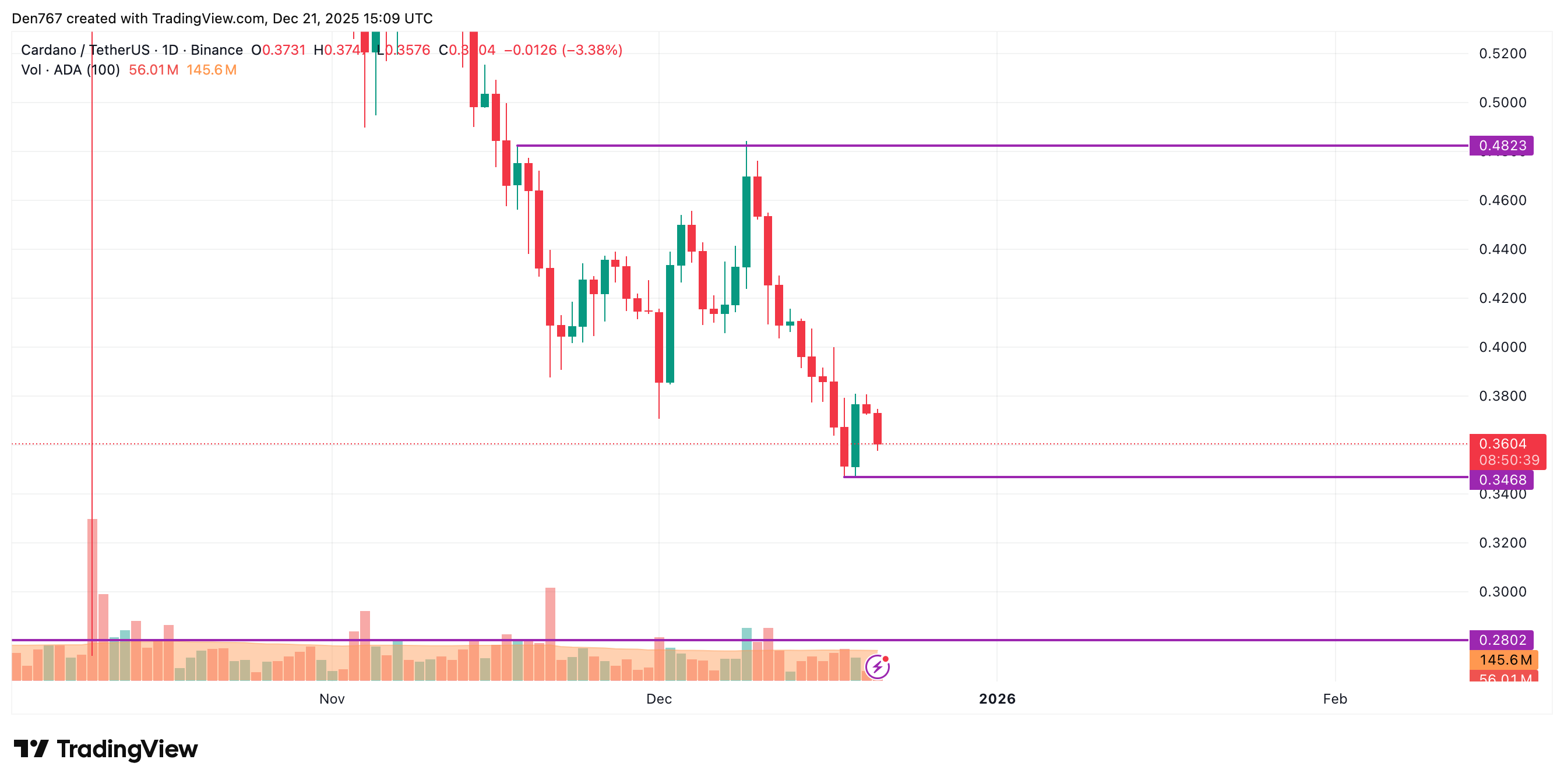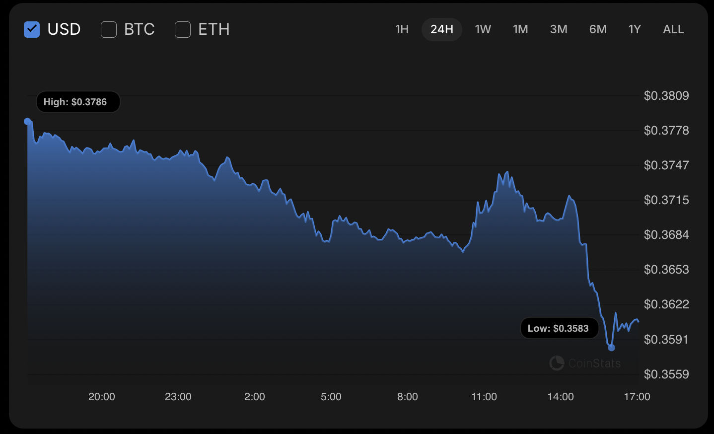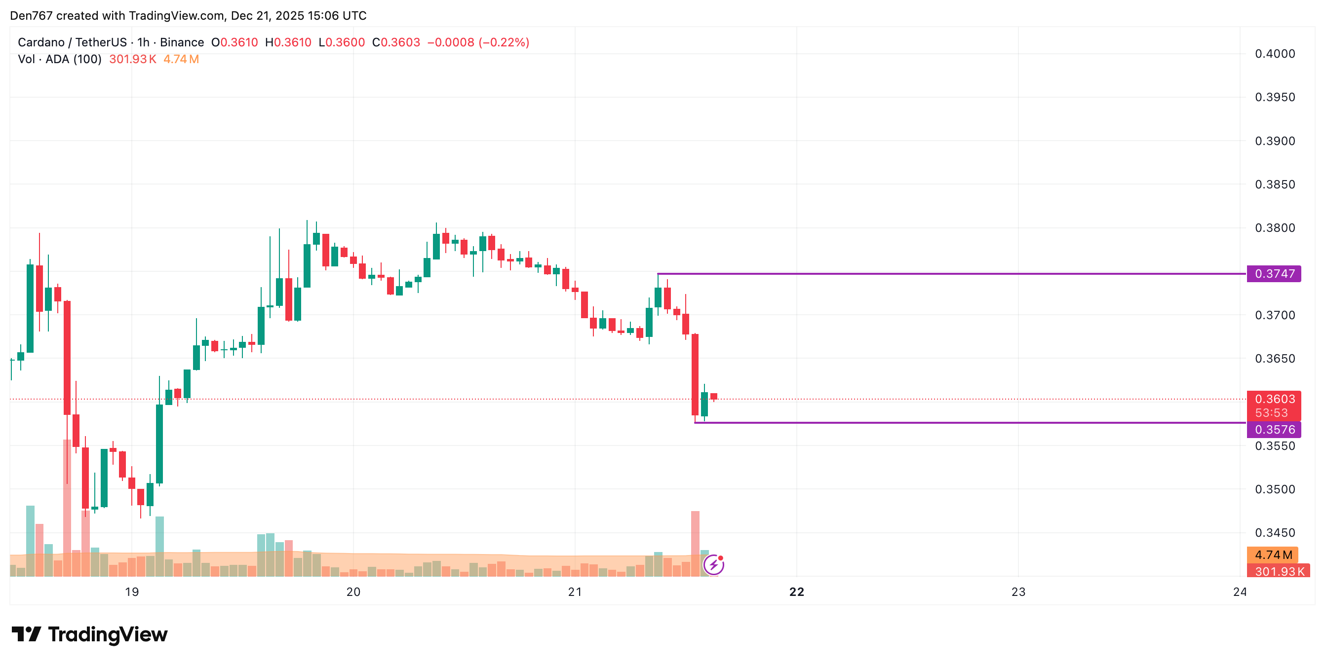 小时线图表显示,ADA汇率正逼近0.3576美元局部支撑位。若多头未能在今日收盘前重掌主动权,行情可能进一步下探至0.3550美元关口。