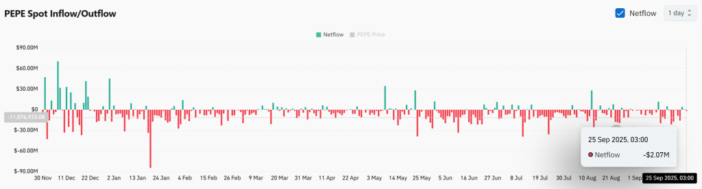 200万美元的PEPE从中心化交易所转出,这进一步强化了看涨逻辑。此类资金流出通常意味着即时卖压减轻,因为转入自托管钱包的代币往往不会立即抛售。该趋势不仅能降低盘口挂单量,更反映出投资者长期持有资产的信心增强。若需求回升,卖方流动性缩减可能加速价格上涨。