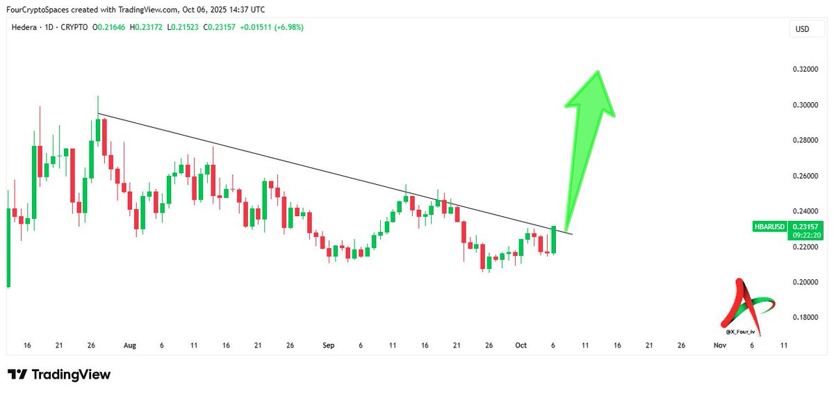 当前HBAR价格徘徊在0.23美元附近,在图表上形成看涨下降楔形后,目前正测试关键阻力位。多位分析师表示,这一趋势可能推动价格向0.30美元甚至更高水平攀升。成交量趋势和更高的低点显示稳定的资金积累,表明动能正在悄然形成。