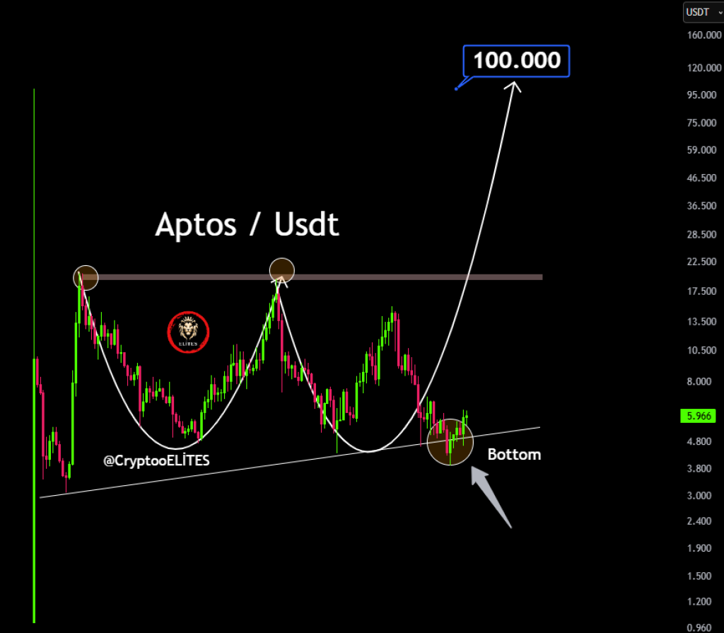 根据@CryptoELITES的分析,当前Aptos价格徘徊在5.96美元左右,这一水平可能代表着大规模上涨前的最终底部。