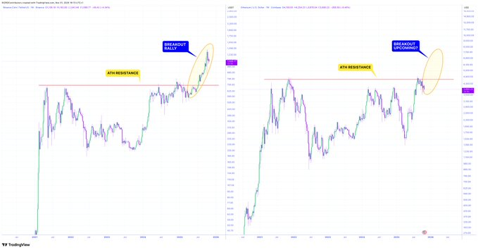 以太坊当前的市场结构似乎正复刻推动币安币进入抛物线阶段的相同形态。随着ETH在关键阻力位附近企稳,交易员正密切关注大规模突破的确认信号。