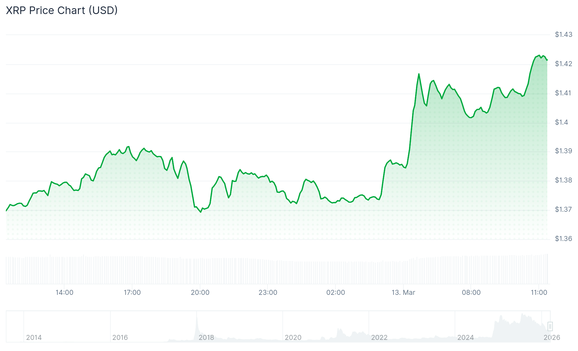 趋势的转变发生在XRP价格突破、并一举站上1.39美元阻力区之时。盘中,XRP从约1.37美元飙升至接近1.41美元,突破了此前24小时内一直压制反弹的关口。