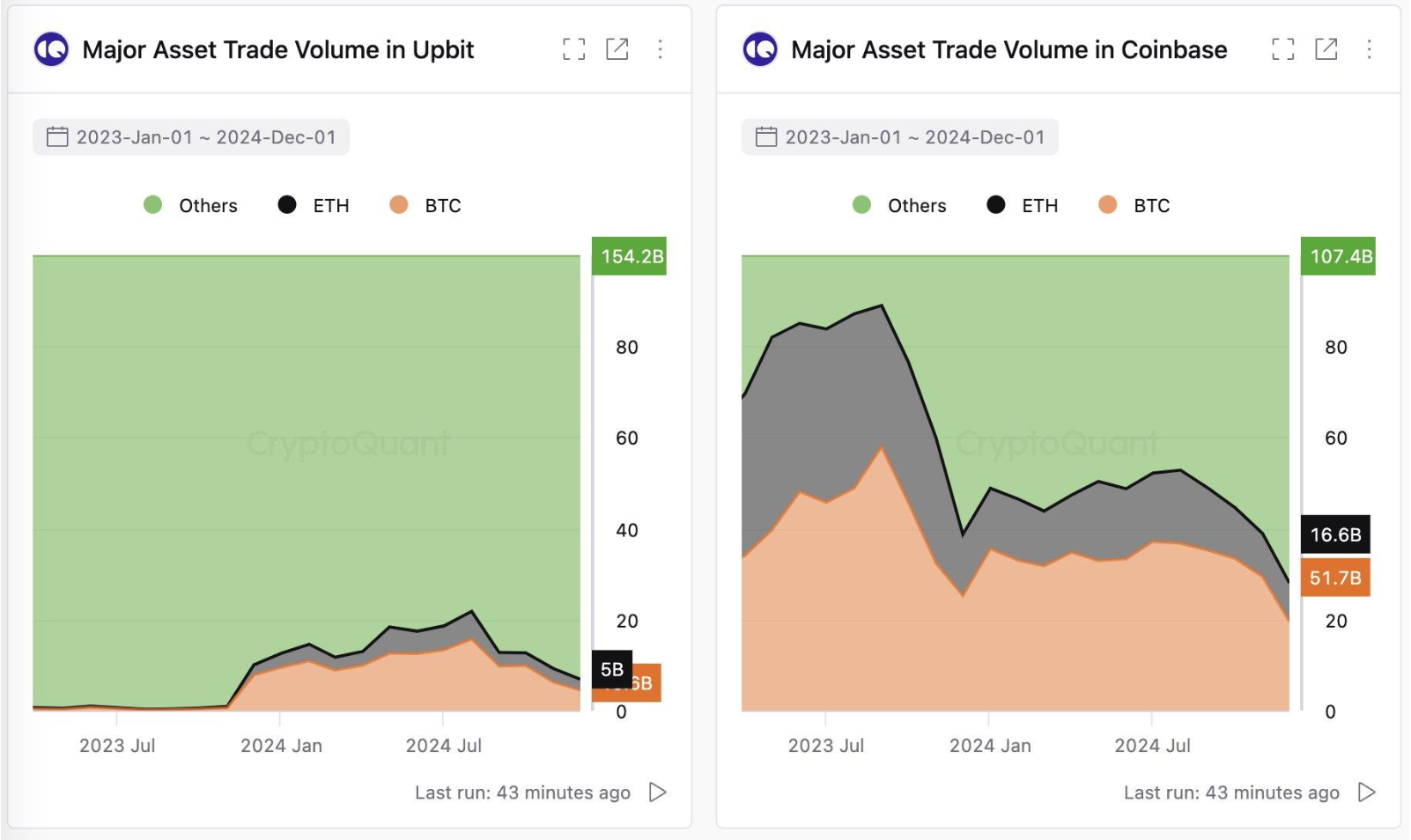 CryptoQuant首席执行官Ki Young Ju告诉crypto.news,强劲的需求可能来自韩国散户投资者,他们"相比美国投资者对风险资产的胃口要大得多"。"韩国的加密货币交易量早已超过当地股票市场(科斯达克),在altcoins方面,韩国领先全球。到2024年底,Coinbase的月度altcoin交易量为1070亿美元,而Upbit的接近1540亿美元。"