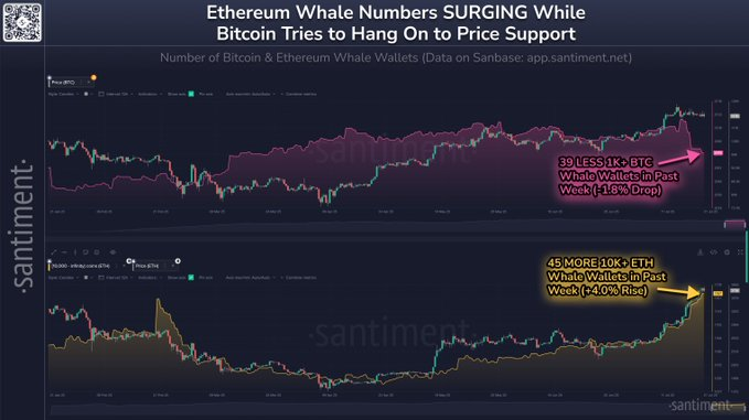 尽管短期走弱,链上数据显示以太坊鲸鱼活动激增。过去一周持有超1万ETH的钱包数量增加45个(增幅4.0%),而同期持有超1000BTC的钱包减少39个(降幅1.8%)。在此期间,以太坊上涨约25%,比特币则下跌3%,表明大额持有者对ETH兴趣升温。