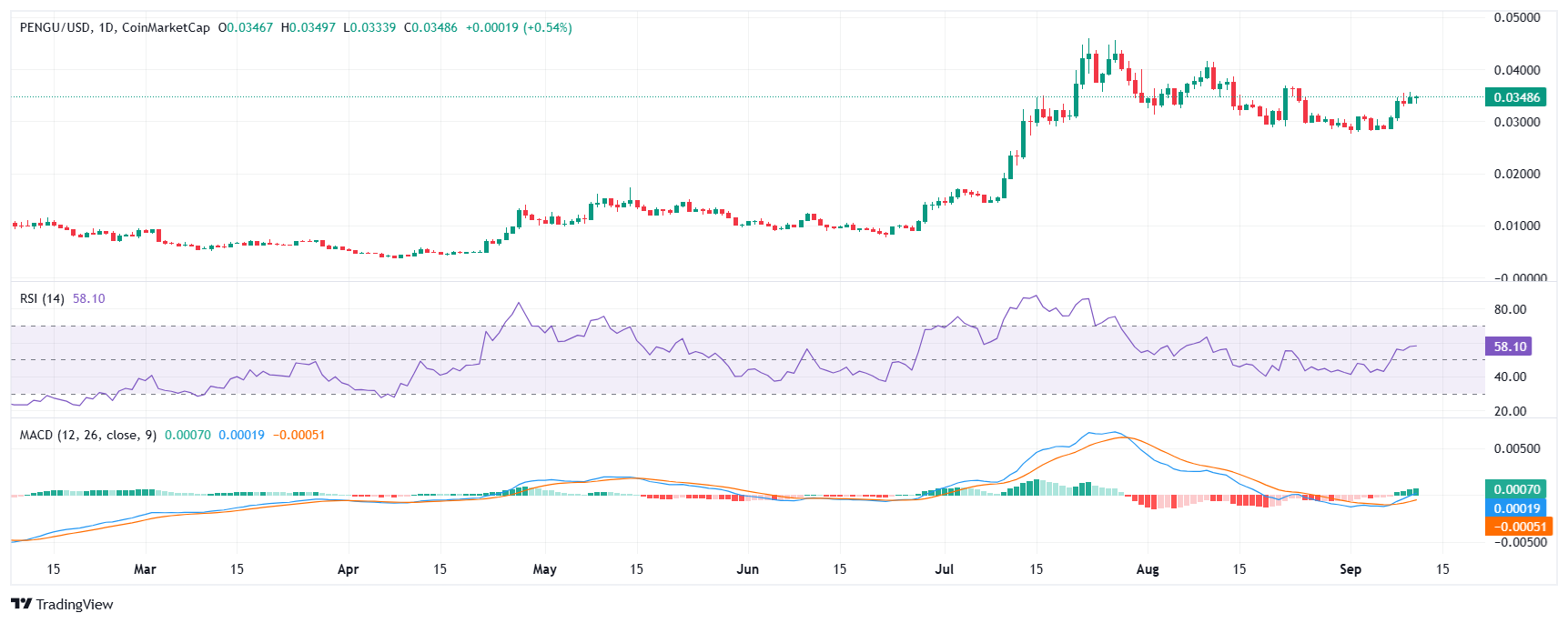 分析师指出,PENGU正重现爆发性周期走势,可能很快触及0.1美元目标位,随后进一步上探0.22美元高位。当前PENGU价格跃升9.72%至0.0374美元,突破关键均线阻力,MACD指标呈现看涨金叉,RSI指标仍低于超买区间。