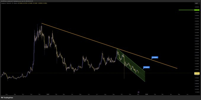 DOGE仍处于已主导价格数月的下降通道内。该形态呈现连续降低的高点与低点,与可控下降趋势相符。