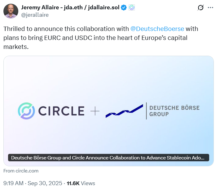 Circle与德意志交易所合作,在欧洲市场整合USDC和EURC。