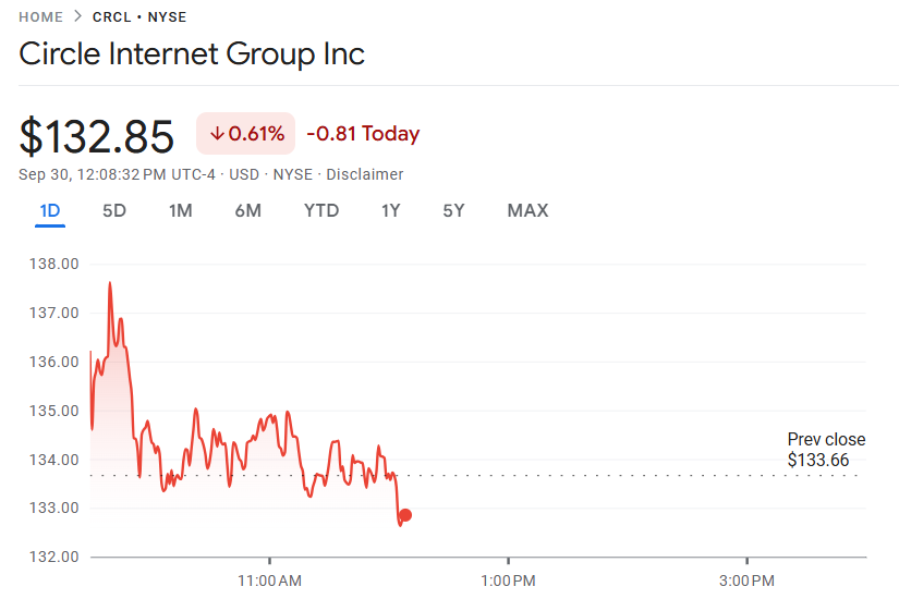 在纽约证券交易所上市的Circle股票(代码CRCL)近期呈现波动走势。9月30日收盘价报133美元,10月1日盘前交易微涨至134.45美元。过去一年间,该股交易区间为64美元至298.99美元,目前市值达307.3亿美元。