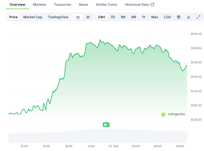 Solana(SOL)价格周五触及121.50美元后回升至140美元,单日涨幅14%,但过去30日累计下跌30%