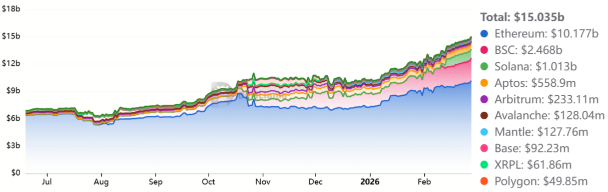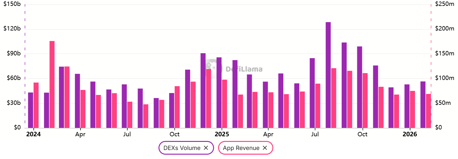 2026年2月,以太坊DEX交易量降至565亿美元,较2025年8月峰值1285亿美元显著萎缩。同期Solana月交易量为955亿美元,低于8月的1206亿美元。活动收缩影响了网络手续费和去中心化应用(DApp)收入,削弱了持有以太币的短期激励。