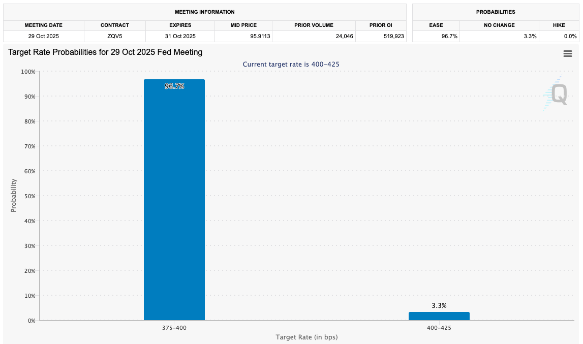 即将公布的美联储利率决议料将主导宏观头条,尽管政府停摆导致通胀数据有限,市场仍普遍押注降息25个基点。CME FedWatch工具显示该概率超过95%。