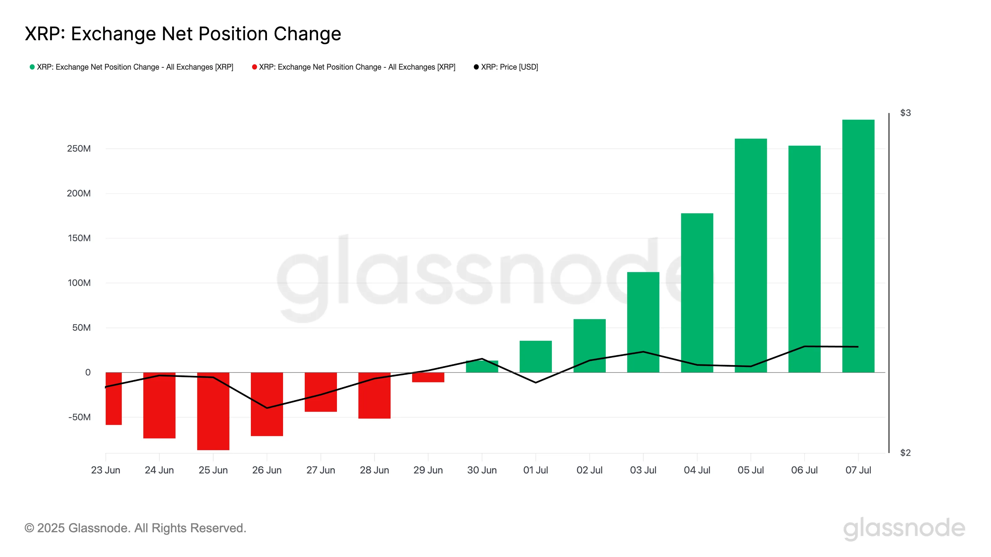Glassnode数据显示,XRP的交易所净仓位变化指标在过去一周持续攀升。该指标追踪中心化交易所的代币净流入量,