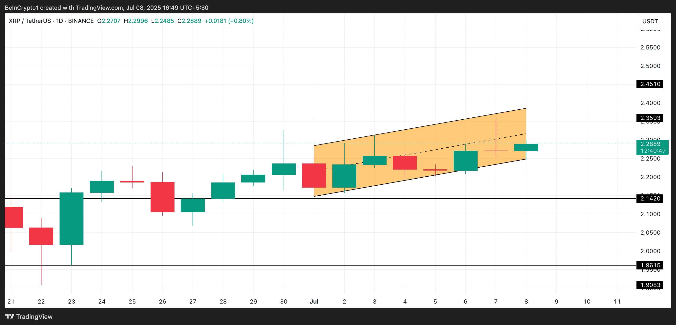 日线图上,XRP正在测试过去一周上升通道的下轨。当资产价格在两条向上倾斜的平行线内形成更高的高点和低点时,便构成上升通道。上轨代表动态阻力,下轨则是动态支撑。因此当价格开始测试下轨支撑(尤其在强劲上涨后),通常意味着上行动能衰竭。