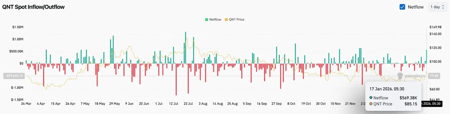 交易所资金流数据证实此轮上涨具有基本面支撑。根据Coinglass统计,1月17日QNT净流入569,380美元,这显著扭转了2025年第四季度主导的资金流出格局。