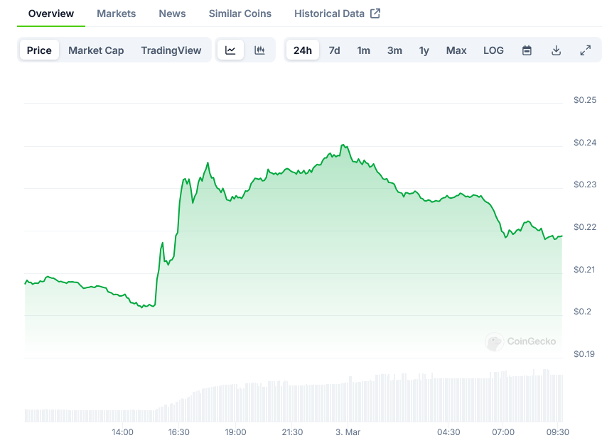 目前市场数据显示,狗狗币交易价格为0.228427美元,24小时内上涨10.66%。该加密货币的交易量达到36.9亿美元,表明尽管近期价格波动,市场活动依然强劲。