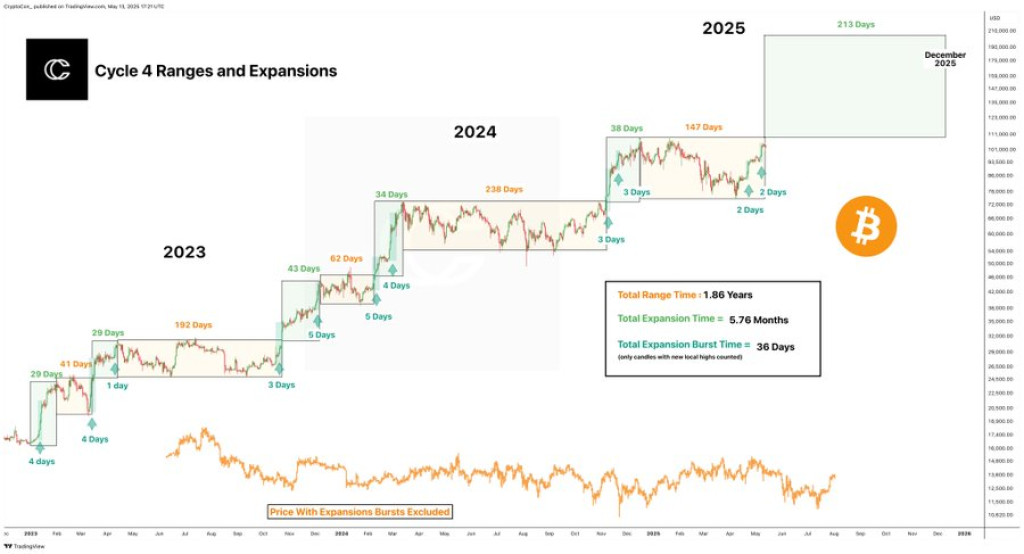CryptoCon认为我们正处于另一次突破的边缘。在观察到2025年初一个为期2天的小幅扩张后,他预测下一个动作可能是迄今为止最大的一个——他称之为"超级扩张"阶段。他的图表预测这一轮上涨可能持续长达213天,到2025年12月,比特币价格可能进入六位数区间。