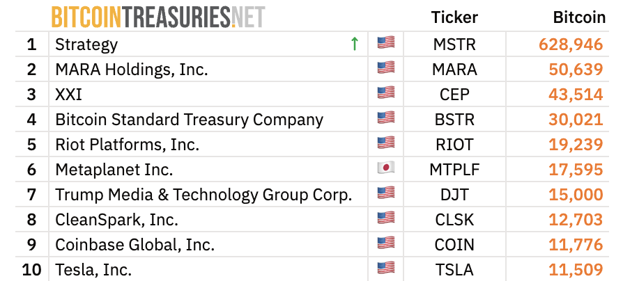 根据Bitcointreasuries最新数据,Metaplanet目前位列全球企业比特币持仓量第六位,仅次于Strategy、MARA等知名机构。值得注意的是,Strategy近期新增155枚BTC储备,使其总持有量达到惊人的628,946枚。