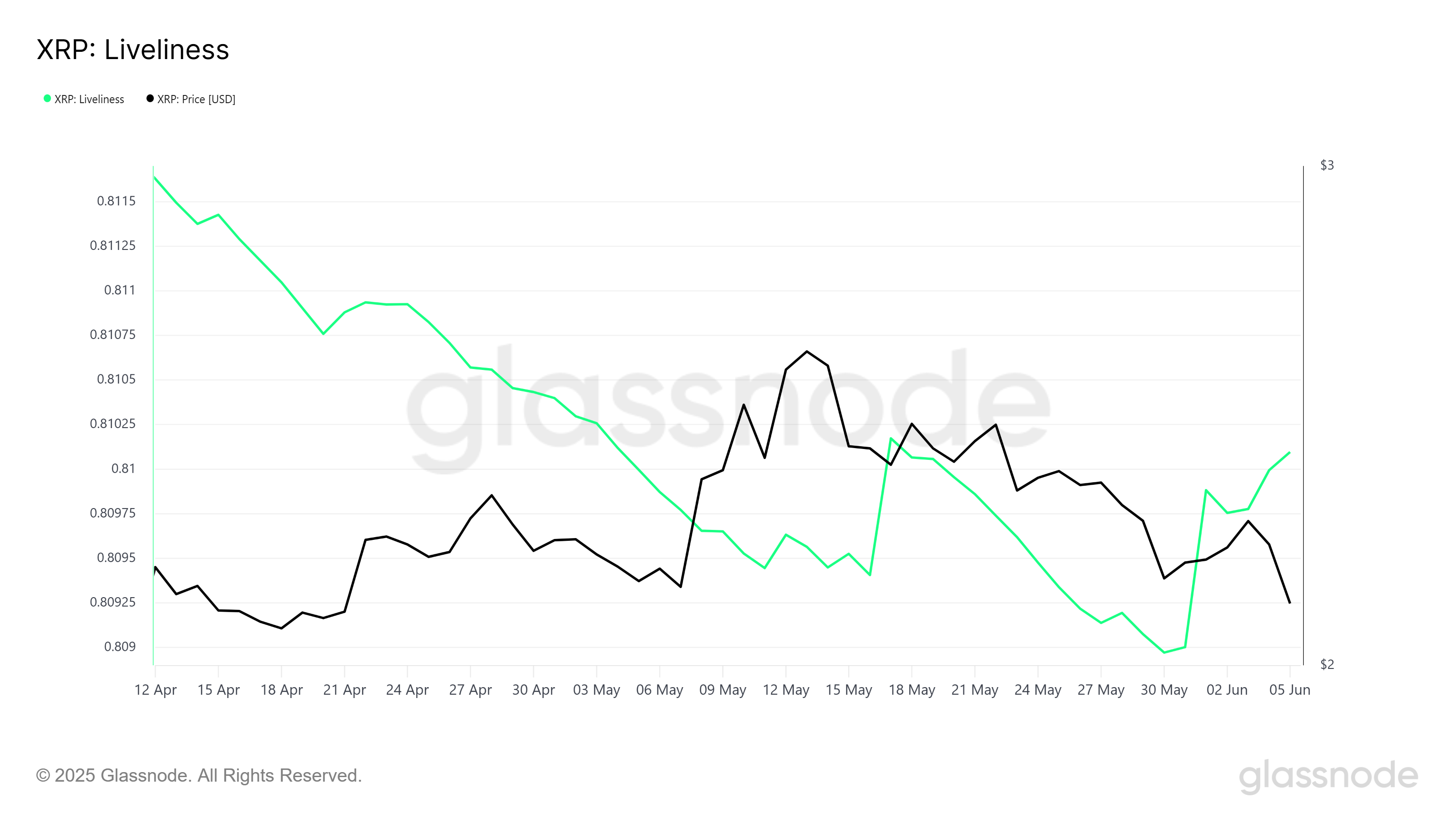 XRP整体走势呈现分化。追踪长期持有者(LTH)交易活跃度的Liveliness指标微升,暗示部分长期投资者或因近期价格下跌开始抛售。通常这种下跌中的抛售行为会加剧市场恐慌,但当前LTH的抛售力度尚不剧烈。