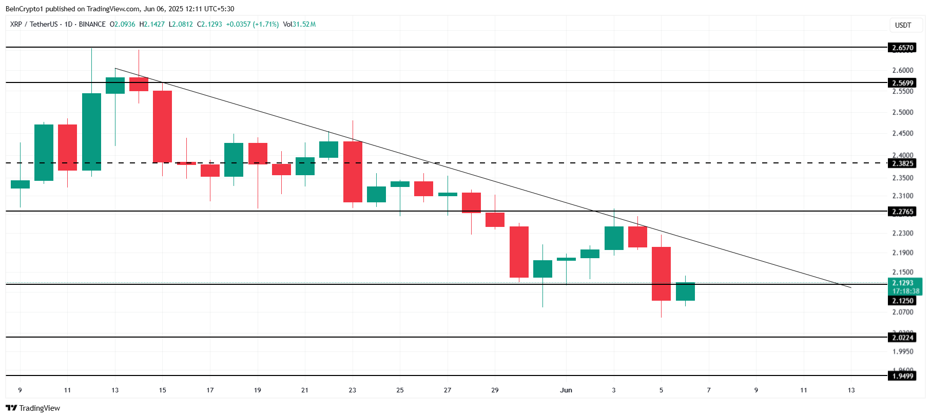 自五月中旬以来的下跌趋势本周仍未打破。但若巨鲸积累量足以压倒LTH抛售,XRP可能以2.12美元为跳板,最终突破2.27美元阻力位。反之,