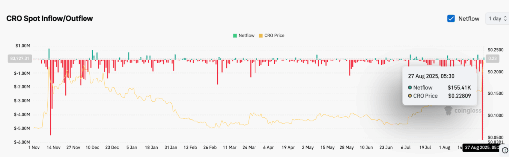 8月26日Cronos交易所净流出约581万美元,8月27日即转为净流入。买盘压力骤降超100%。