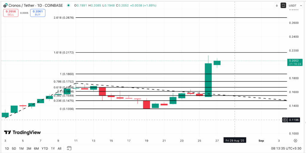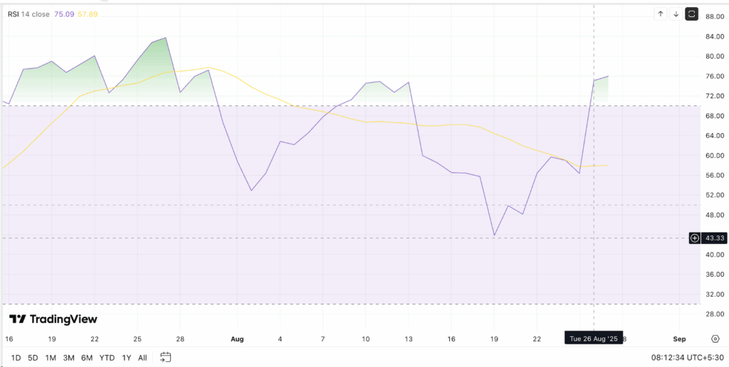 动量指标同样预示调整需求。RSI触及75超买区域——8月13日出现类似情况后,Cronos确实经历回调才再度走高。