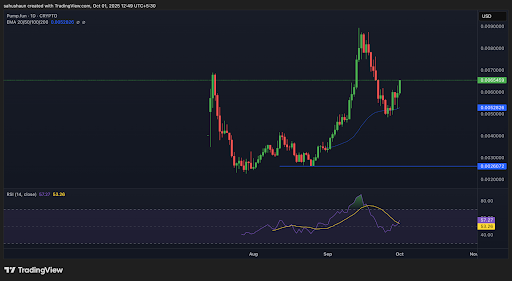 日线图呈现清晰的复苏轨迹。自近期高点0.009美元大幅回落后,PUMP在0.0026美元区间获得稳固支撑,随后在整个9月开启稳步上涨。尽管近期盘整阶段考验投资者信心,但该加密货币坚守50日均线上方的能力强化了潜在看涨结构。移动平均线仍保持上升斜率,表明中期趋势仍对买方有利。