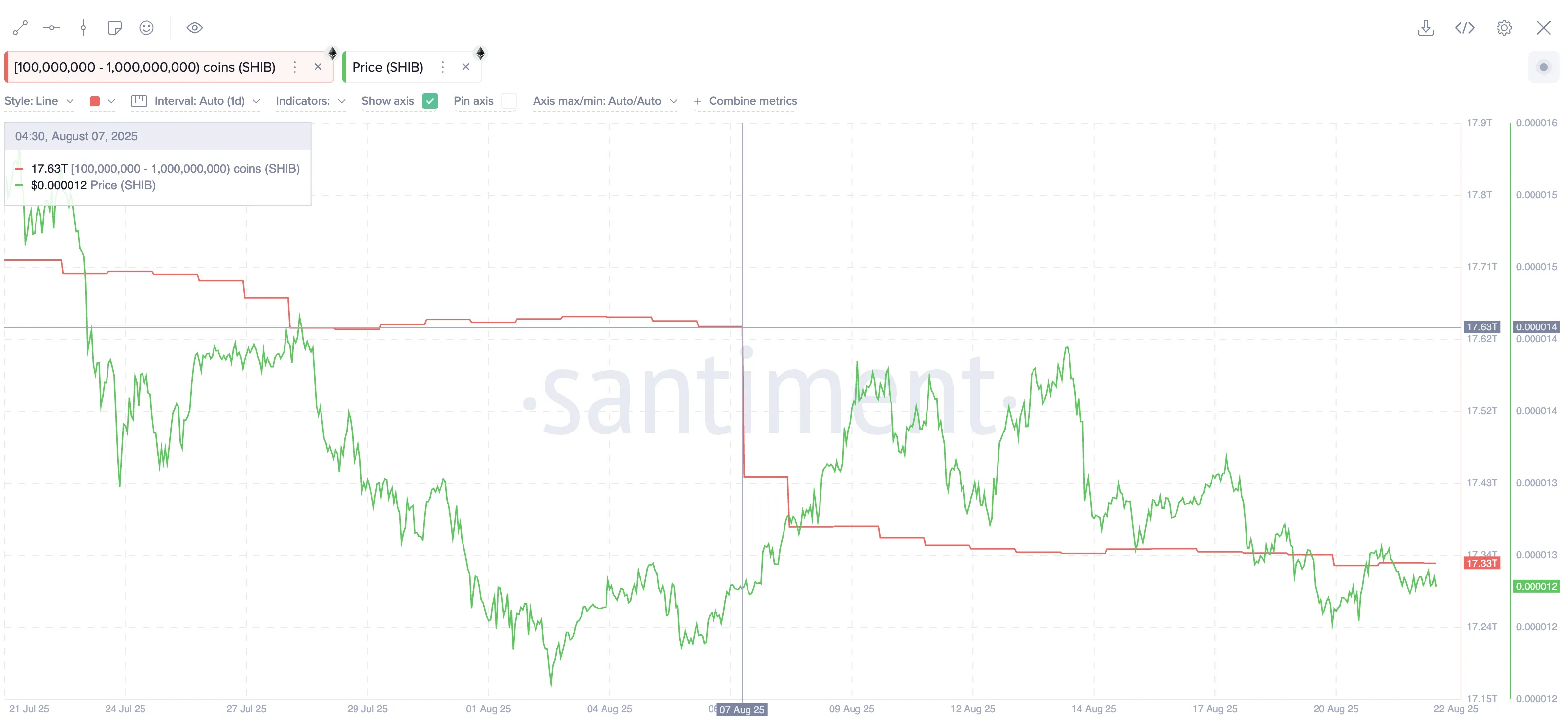 目前减持规模进一步扩大。截至8月21日,这些钱包持仓降至17.33万亿SHIB,相当于抛售约300亿SHIB(价值370万美元)。在SHIB本就疲软的趋势下,这种减持暗示若抛售持续,代币可能面临更深回调。