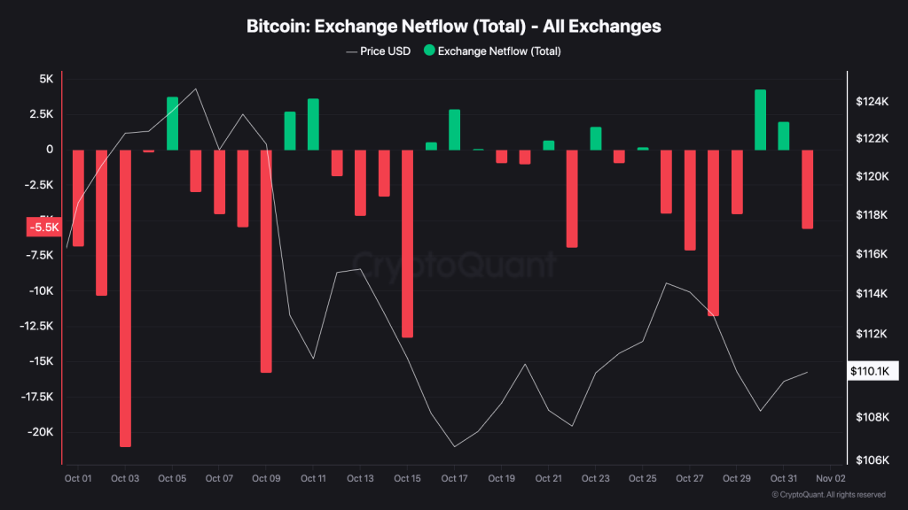 数据显示,10月期间比特币持续净流入交易所——这通常是代币准备抛售的信号。10月3日、15日和27日出现显著峰值,单日均有超10,000枚BTC转入交易平台。