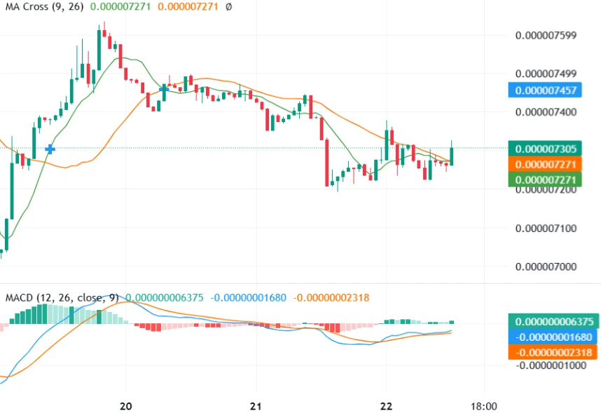随着迷因币柴犬在小时交易图上逐渐逼近黄金交叉形态,该加密货币正显现复苏势头。这一潜在技术形态的形成源于9日移动平均线逐步靠近26日移动平均线——当短期均线突破长期均线时,通常被视为看涨信号。截至发稿,SHIB报价0.000007328美元,较长时间受制于0.00001美元关口下方的持续抛压后,终于迎来小幅反弹。