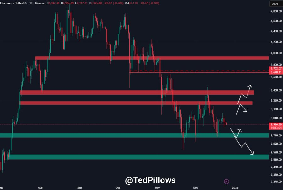 截至撰稿时,以太坊交易价格徘徊在2924美元附近。目前多空双方均未能主导走势,3000美元关口持续形成阻力,而2700-2800美元区间构成支撑屏障。根据