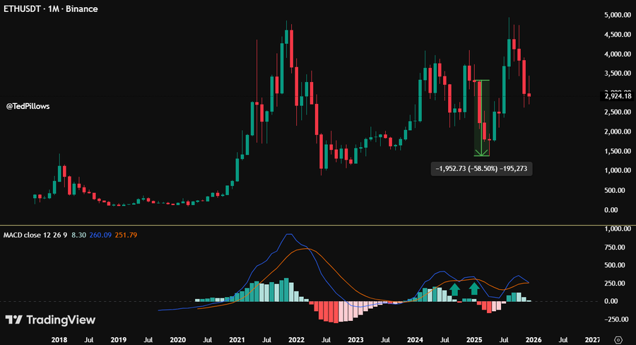 以太坊月线图表显现MACD死叉形态的潜在迹象。MACD线即将下穿信号线,这通常预示着动量转换。该形态曾在2025年初出现,随后三个月内ETH价值缩水超58%,从3300美元上方跌至1350美元附近。然而在2024年第三季度,类似信号并未导致持续下跌,价格反而快速收复失地。正如分析师所言:“表面看似看跌,但行情并未延续。”这段历史使得交易者对当前形态保持谨慎态度。