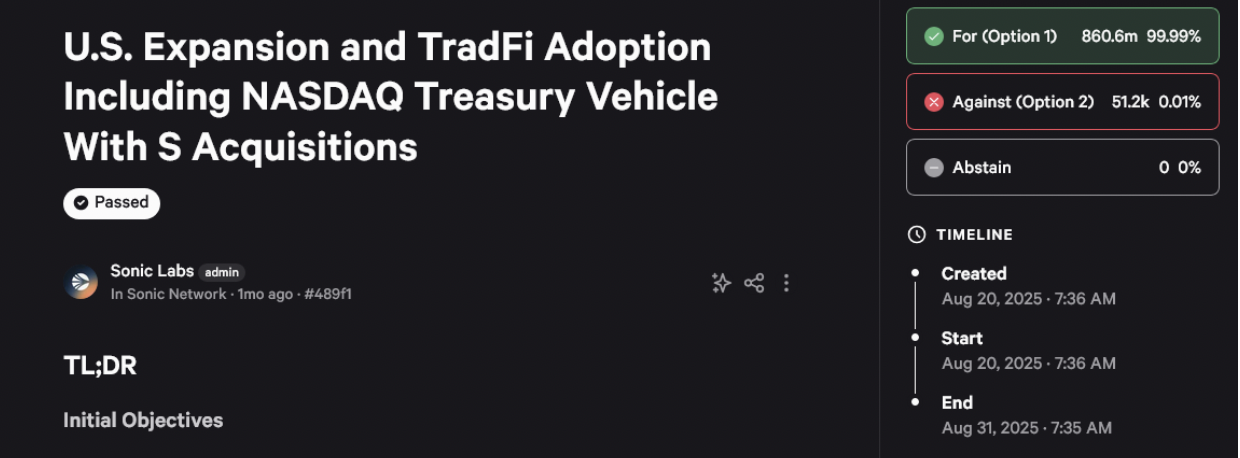 当前市场更青睐低流通量、高完全稀释估值(FDV)的结构,其中基金会扮演运营控股公司角色,通过业务发展、市场结构优化等改变排名和品质认知。Sonic的解决方案是谨慎现代化:明确分配代币用于美国ETF配置、纳斯达克DAT国库管道融资,以及Sonic USA运营资金。所有分配都将链上记录、限时执行并公开追溯。