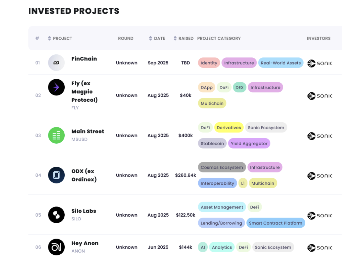 创新者基金是定向资本部门,专注于利用Sonic技术实现日常可用性的底层协议和消费级应用。目前已公布的投资组合包括: