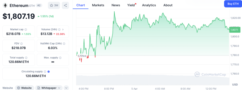 图表数据显示,从4月4日晚开始出现重大价格上涨,ETH从约1779.60美元跃升至1820美元以上。尽管随后出现小幅价格波动,但以太坊在4月5日一直保持在1800美元以上。网络的总供应量和流通供应量为1.2066亿ETH,没有固定的最大供应量。成交量与市值比率为6.03%,表明相对于资产总价值的交易活动适中。