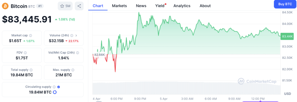 价格活动表明,4月4日晚出现上涨,比特币从约82,660美元升至84,000美元以上,随后在83,500美元附近盘整。截至4月5日,表现保持稳定,出现小幅波动。目前,比特币的供应量为1984万枚,而比特币的最大供应量为2100万枚。完全稀释估值的增加相当于当前1.75万亿美元的市值。成交量与市值比率为1.94%,表明尽管价格较高,但交易活动较低。