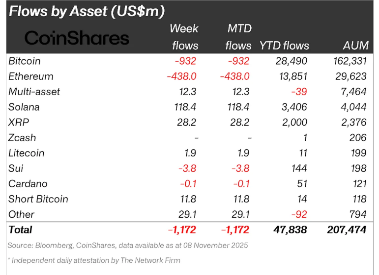 CoinShares 11月10日发布的数字资产基金流向报告显示,Solana(SOL)和瑞波币(XRP)已连续数周获得资金净流入。在SOL ETF持续吸引机构资本的背景下,SOL单周流入达1.184亿美元——Bitwise Solana质押ETF(BSOL)与灰度Solana ETF(GSOL)两周内总流入额飙升至3.36亿美元。报告指出,尽管加密货币市场近期暴跌,但由于机构强烈关注,Solana基金资产管理规模(AuM)仍突破40.4亿美元。