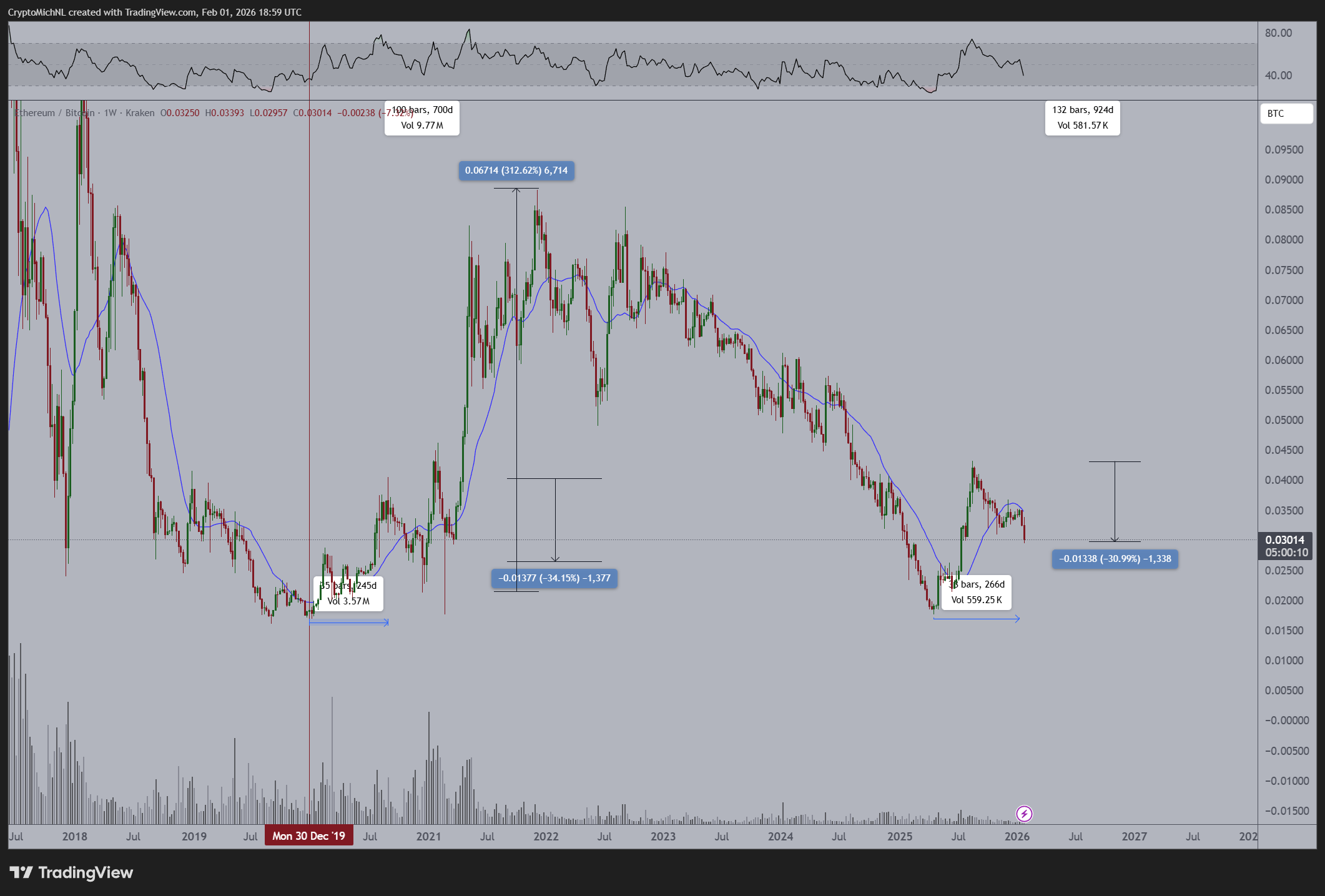范·德·波普指出,在上一个可比周期中,以太坊在完成深度回调阶段后,最终对比特币实现了超过300%的涨幅。考虑到以太坊已从近期高点下跌约31%,且大幅低于历史峰值,他认为若整体市场环境趋稳,大部分下行风险或已被市场消化。