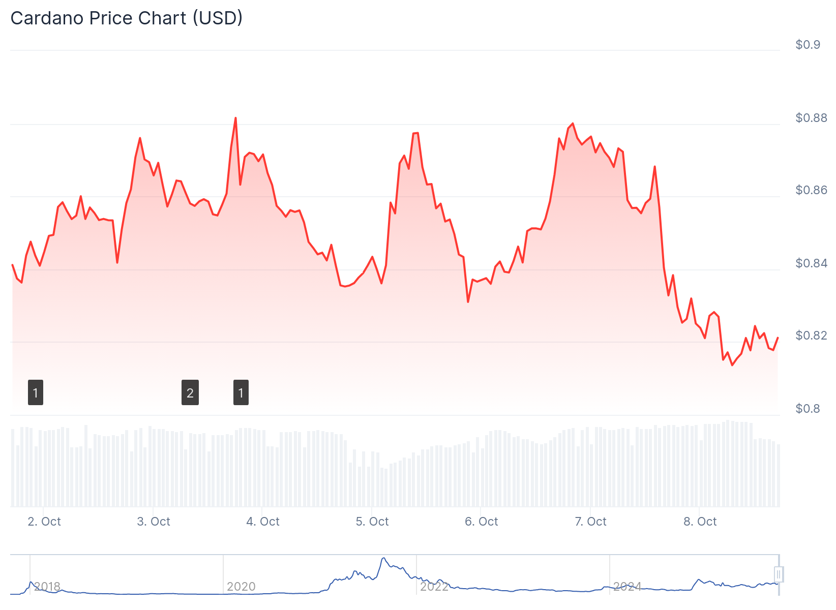 卡尔达诺(ADA)当前交易价约为0.81美元。本周早些时候曾触及0.88美元高点,虽然近期出现近6%的回调,但在过去数日0.70-0.88美元区间交易时展现出强大韧性。随着比特币现货ETF获批预期升温,包括卡尔达诺在内的加密货币市场可能受益于这一价格走势。