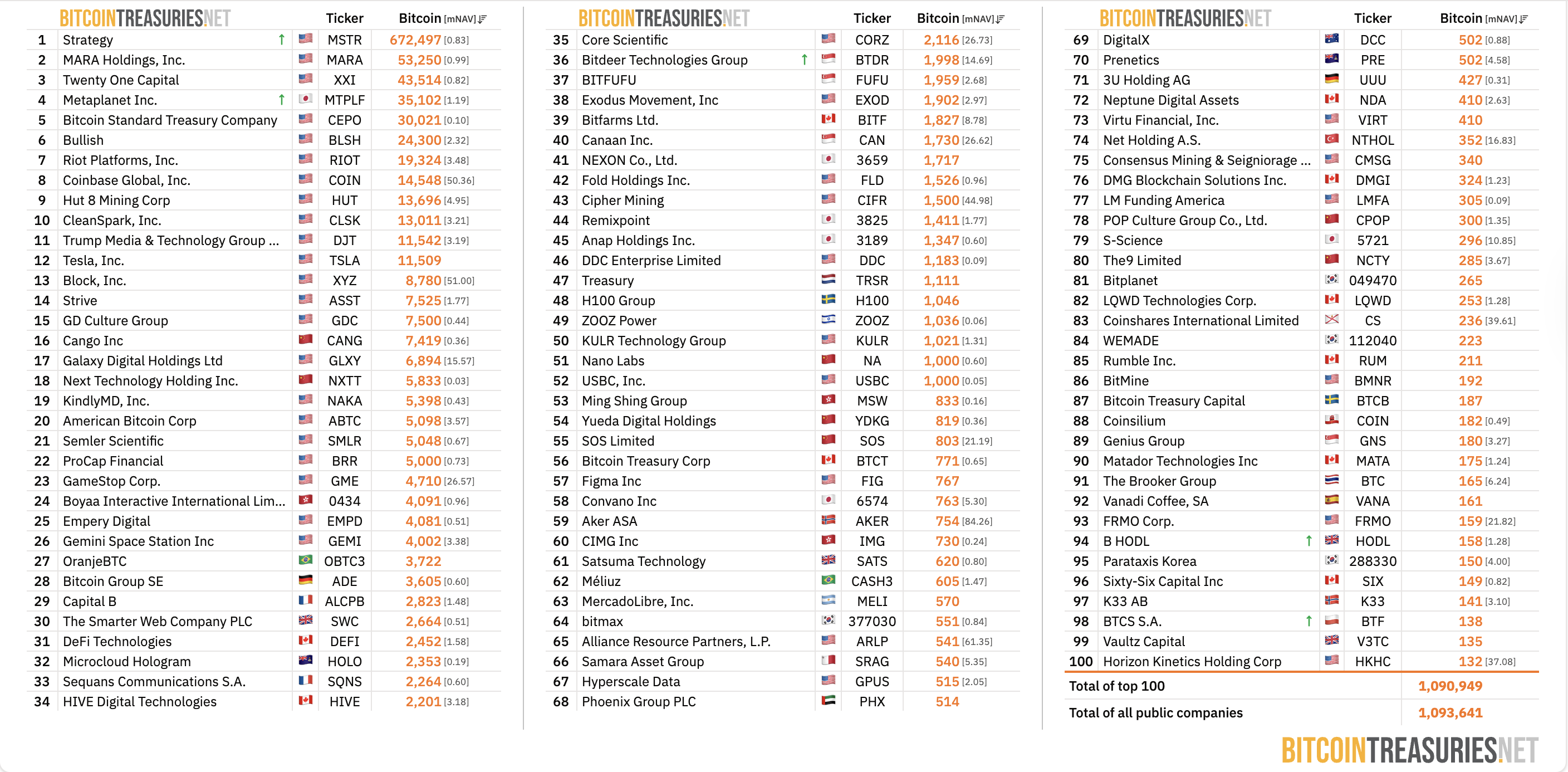 据BitcoinTreasuries.Net统计,Hut 8在企业国库中持有13,696枚BTC,价值超12亿美元,在比特币国债公司百强榜中位列第九。数据显示,American Bitcoin以5,098枚BTC(约4.58亿美元)的储备量排名第二十。在行业普遍承压的背景下,Hut 8与American Bitcoin仍持续增持比特币储备。