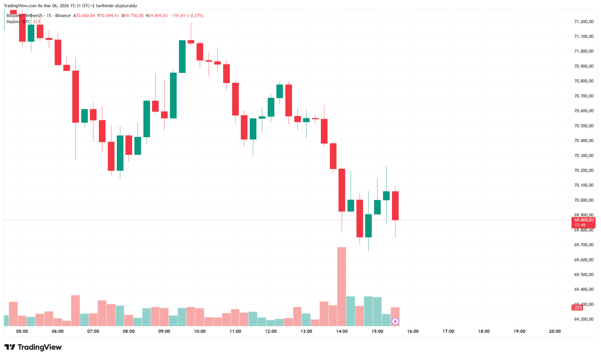 比特币价格持稳于7万美元,全球紧张局势下山寨币呈现观望态势加密货币市场短期趋稳 比特币窄幅震荡 过去24小时内,加密货币市场整体呈现盘整态势,比特币价格波动幅度明显收窄。截至当前,比特币交易价格维持在69500至70600美元区间内小幅震荡。 市场动态总览 经历前期剧烈波动后,比特币价格逐渐稳定在七万美元关口附近,较本周早些阶段创下的高点出现小幅回调。山寨币市场同样呈现交投清淡态势,多数币种价格波动幅度维持在±1%以内,市场整体进入潜在变盘前的平静期。 值得关注的是,本周衍生品市场曾出现大幅清算现象。当前比特币价格虽回升至71000美元附近,但周末市场交易量仍呈现季节性放缓特征。此前比特币价格曾突破76000美元高点,随后出现近10%的技术性回调。22 分钟前0.04%