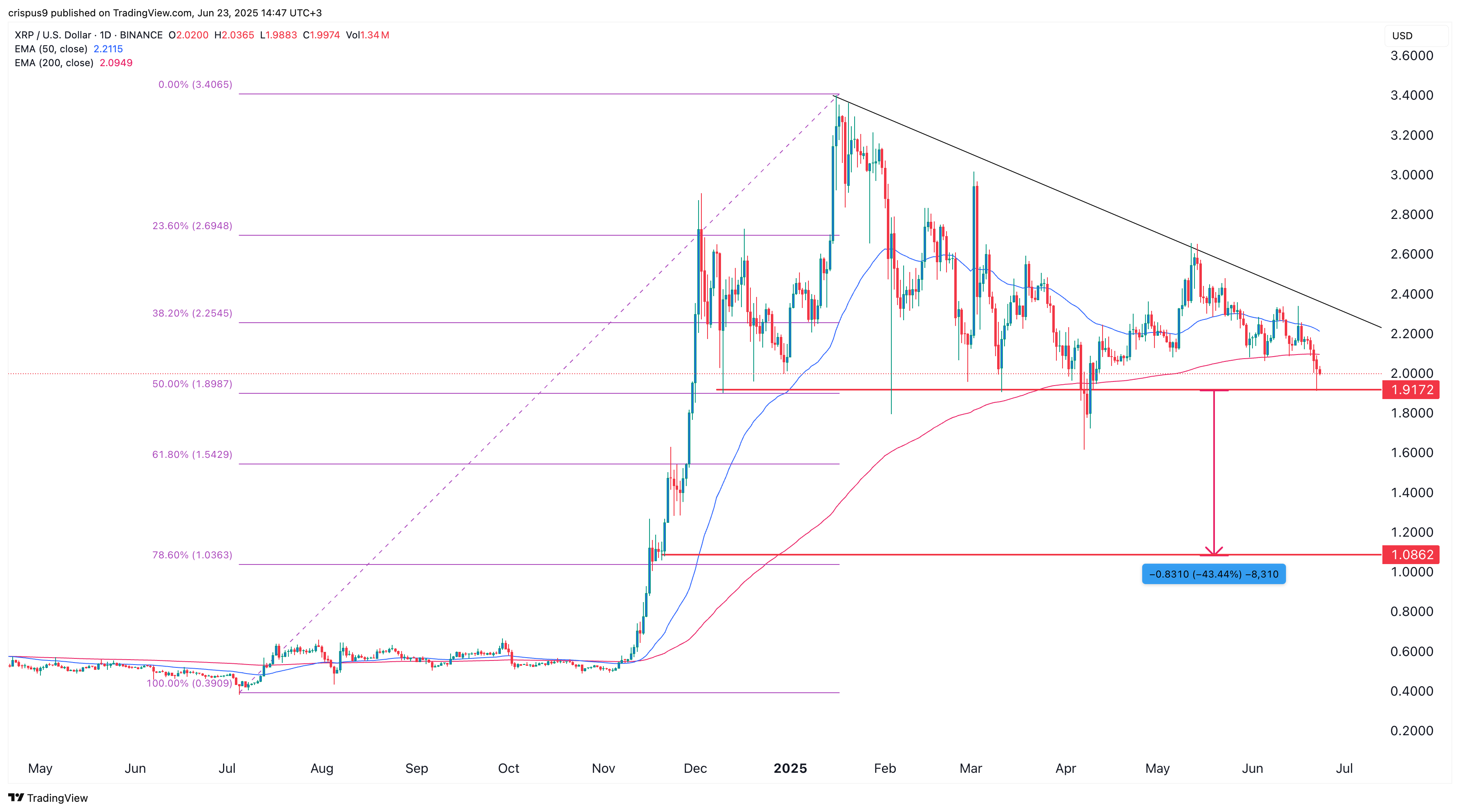 日线图显示,XRP过去数月持续处于下行通道,从1月份的3.40美元跌至当前2美元附近价位。