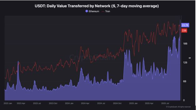 最新数据显示,两大网络间的竞争已进入白热化阶段。过去两年间,波场网络始终是USDT转账领域的霸主,但以太坊凭借其快速扩张的DeFi生态,首次在USDT交易量上实现了反超。