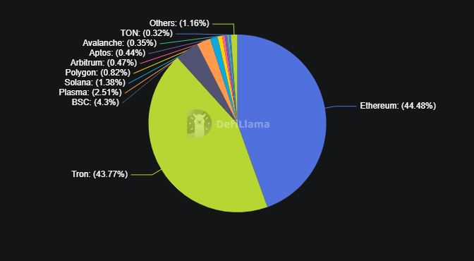 上周以太坊网络的USDT周转账量达到237亿美元,而波场同期数据仅为2200万美元。这种竞争态势在双方控制的USDT总量上更为明显——根据DeFiLlama统计,以太坊持有777.6亿USDT,约占该稳定币流通总量的44.48%;波场则持有762.3亿USDT,占比43.77%。