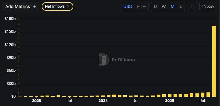 值得注意的是,在市场波动背景下,以太坊网络活动仍保持强劲。最令人瞩目的是资金流入规模——近四周净流入飙升至1640亿美元,创下历史最高纪录,明确显示更多流动性正在涌入网络。