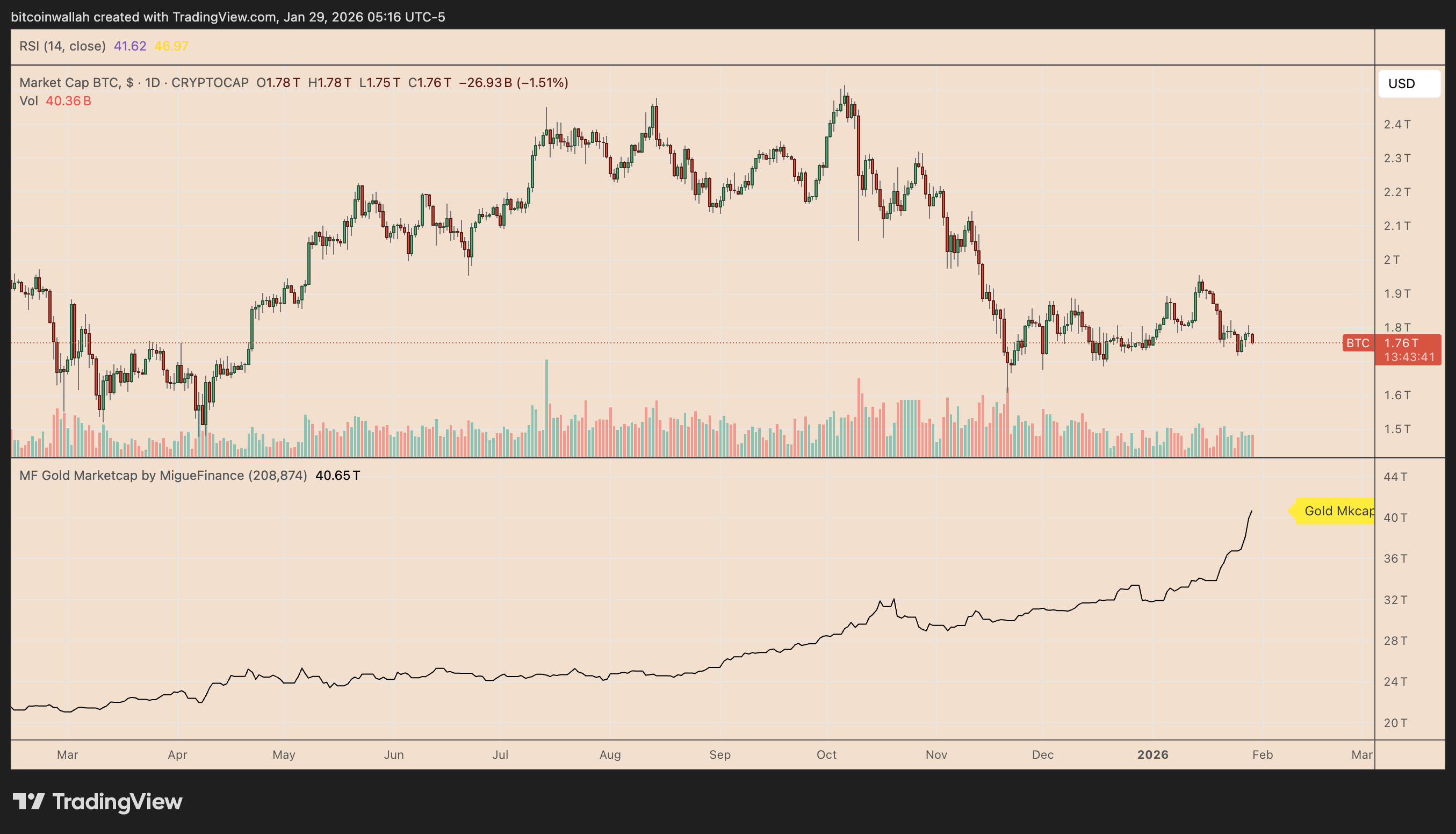 截至1月,比特币的市值仅约为黄金41.69万亿美元市值的4.30%。