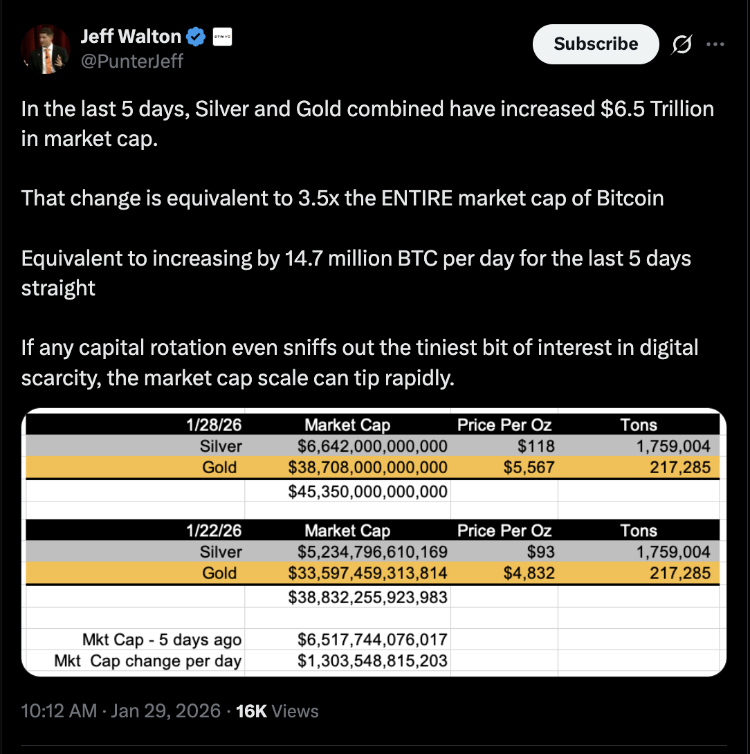 比特币国债公司Strive的首席风险官杰夫·沃尔顿认为,比特币只需获得一小部分原本投向黄金的资金流入,便足以产生显著影响。