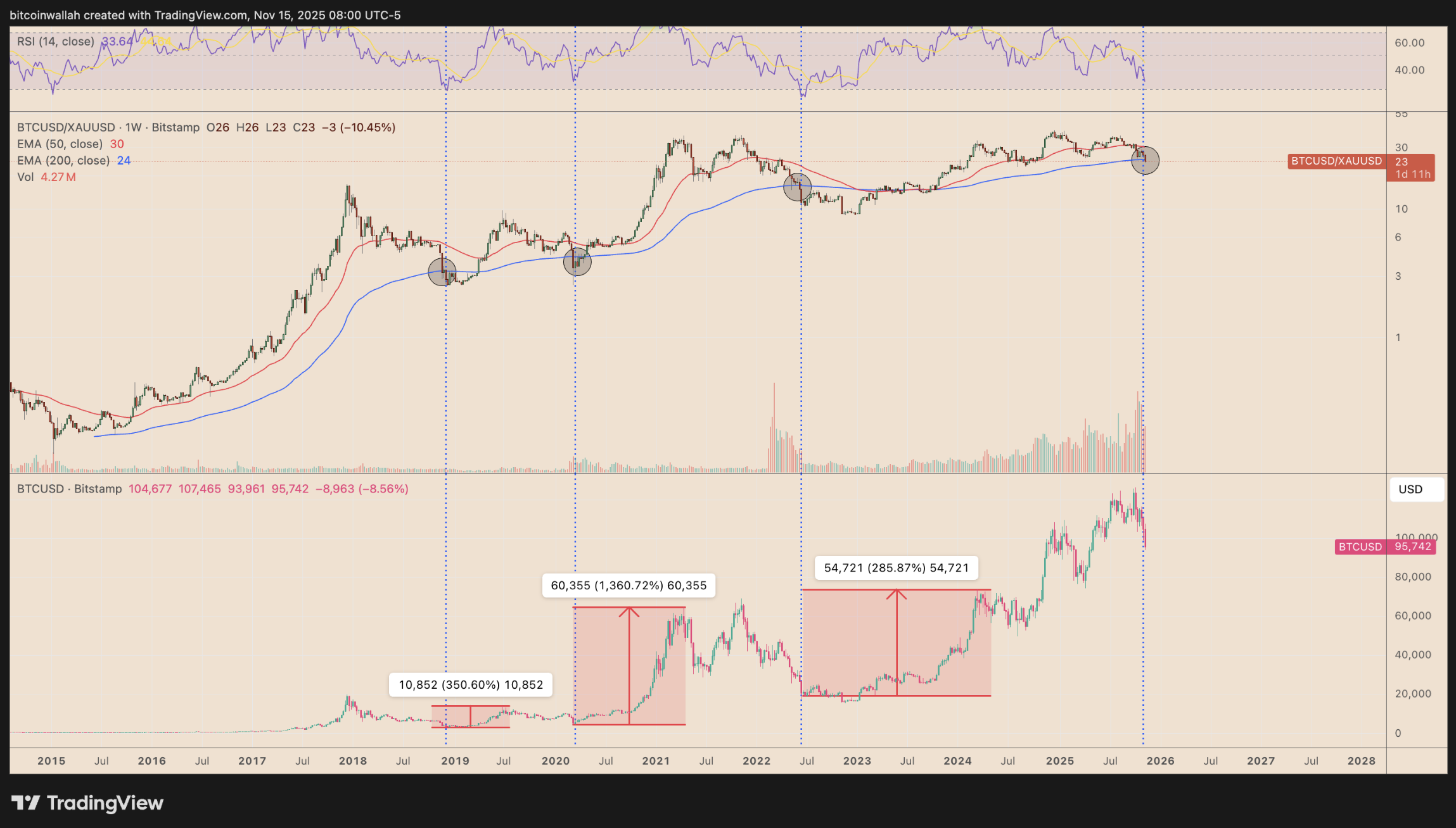 尽管比特币(BTC)近期跌破10万美元关口引发市场焦虑,但一项追踪黄金与比特币长期比率的指标正释放关键信号。截至11月15日,BTC/XAU比率周线下跌10.45%,且跌破200周指数移动平均线(EMA)达4.8%。过去十年数据显示,这种突破现象每次都精准出现在比特币周期大底的核心位置,此次已是第五次出现该技术形态。